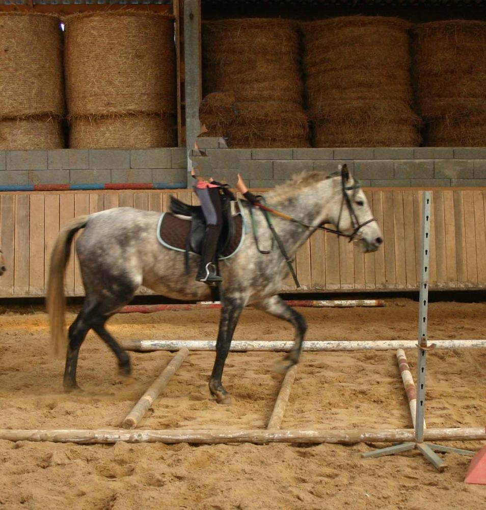 Petite jument au caractère extra. Travail aussi bien en carrière, manège. Part seule ou en groupe en extérieur. Très pratique au quotidien, sociable.